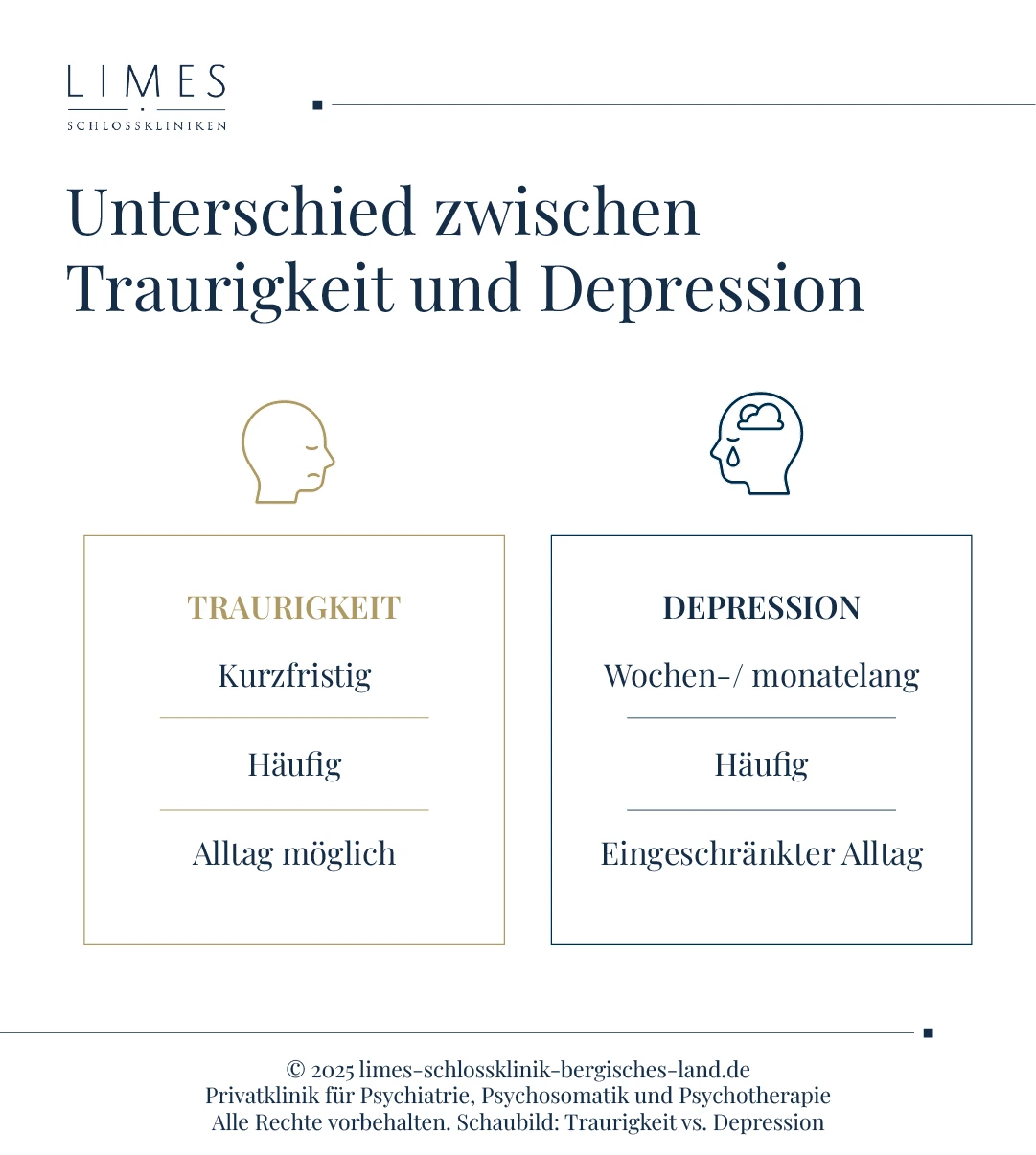 Traurigkeit ist eine normale Reaktion auf belastende Ereignisse und klingt meist nach Tagen oder Wochen ab. Depression hingegen ist eine ernsthafte Erkrankung, die über längere Zeit anhält und mit Niedergeschlagenheit, Antriebslosigkeit und Hoffnungslosigkeit einhergeht. Häufig treten zusätzlich körperliche Beschwerden wie Schlafstörungen oder Appetitverlust auf. Diese Symptome sind so ausgeprägt, dass sie den Alltag erheblich beeinträchtigen.