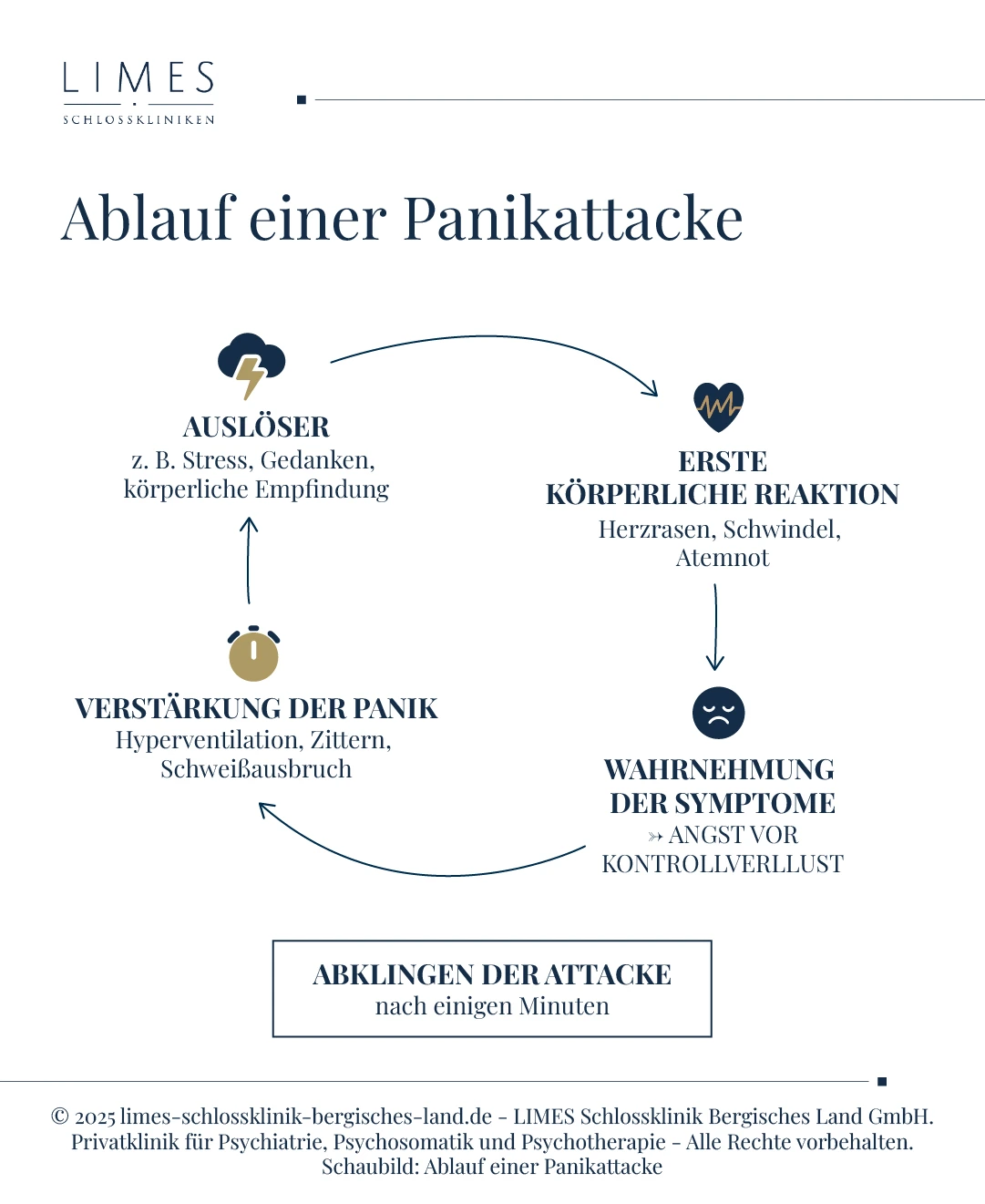 Panikattacken treten häufig zwischen dem 20. und 40. Lebensjahr erstmals auf, können aber in jedem Alter vorkommen. Eine einzelne Attacke dauert in der Regel zwischen fünf und zehn Minuten, auch wenn sie subjektiv deutlich länger empfunden wird. Die körperlichen Symptome wie Herzrasen oder Atemnot können nach dem Abklingen der Attacke noch Minuten bis Stunden nachwirken. Etwa 2-3 % der Bevölkerung entwickeln im Laufe des Lebens eine Panikstörung mit wiederkehrenden Attacken. Das wiederholte Auftreten führt häufig zu einem ausgeprägten Vermeidungsverhalten, insbesondere in Situationen, in denen eine Flucht schwierig wäre – ein Kennzeichen der sogenannten Agoraphobie. Ohne gezielte Therapie kann sich ein Kreislauf aus Angst vor der Angst entwickeln, der den Alltag stark einschränkt.