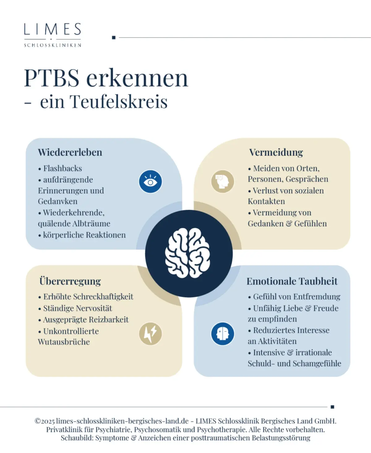 Die posttraumatische Belastungsstörung ist eine schwere Erkrankung, die das Leben ihrer Betroffenen massiv beeinträchtigt, oft durch das Gefühl, in einer permanenten Gefahrensituation festzustecken. Doch dank spezialisierter, integrativer therapeutischer Verfahren, die Stabilisierung, Trauma-Exposition und körperorientierte Ansätze vereinen, ist sie heute sehr gut behandelbar. Der Weg zur Heilung beginnt mit der mutigen Entscheidung, die Kontrolle über die eigene Vergangenheit zurückzugewinnen und professionelle Hilfe anzunehmen. In der LIMES Schlossklinik Bergisches Land steht Ihnen ein spezialisiertes Team zur Seite, das Ihnen in einem geschützten Rahmen hilft, das Trauma zu verarbeiten und wieder in ein selbstbestimmtes, sicheres Leben zurückzufinden.